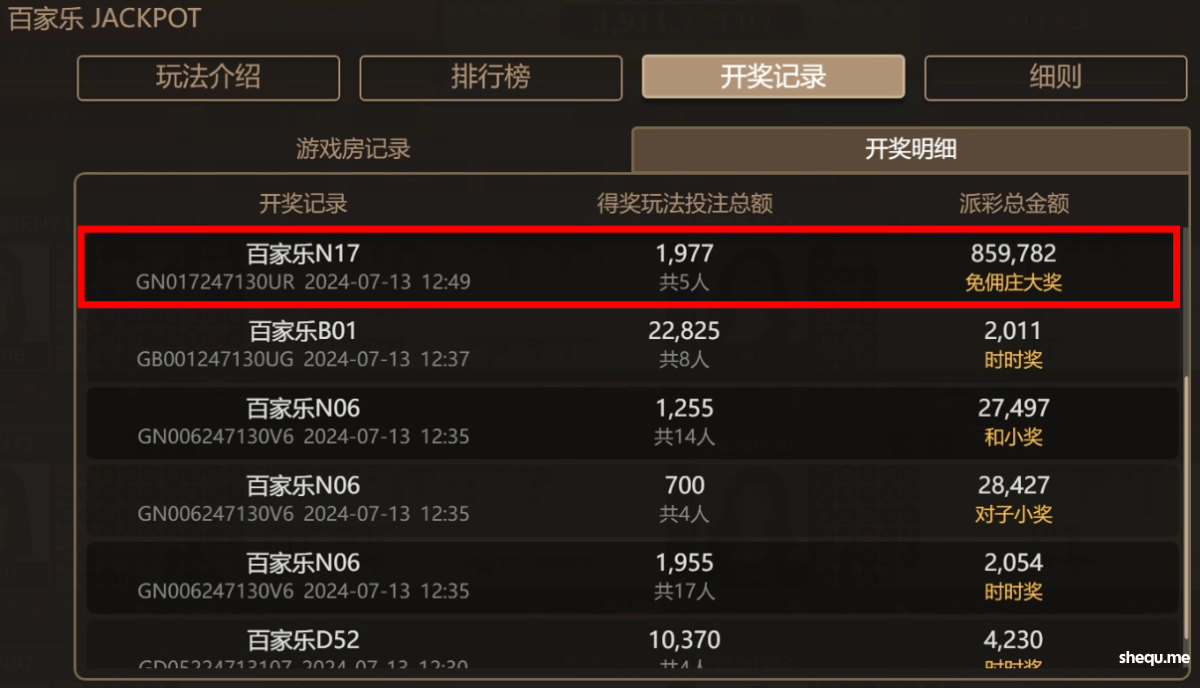 5位幸运儿共下注1,977元共夺免佣庄大奖¥859,782元,盈利高达435倍!