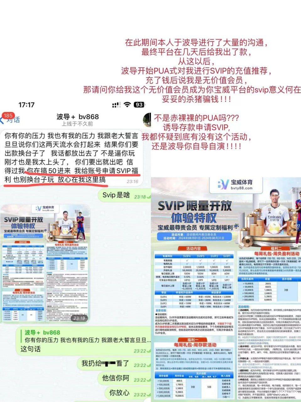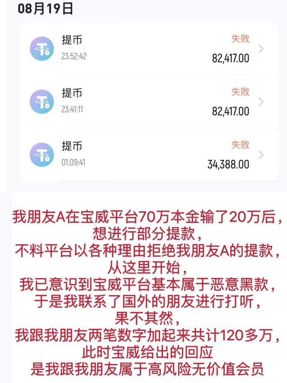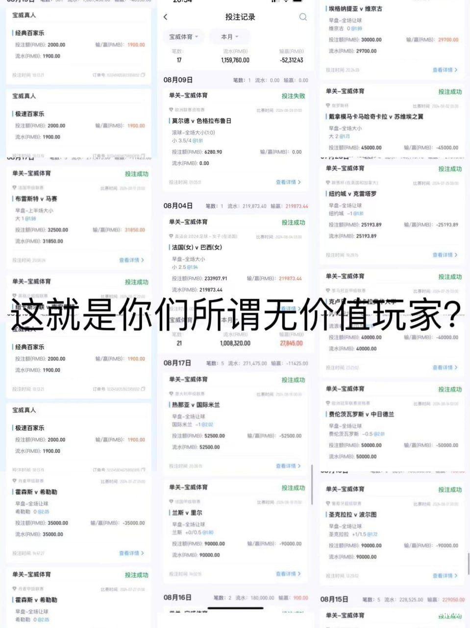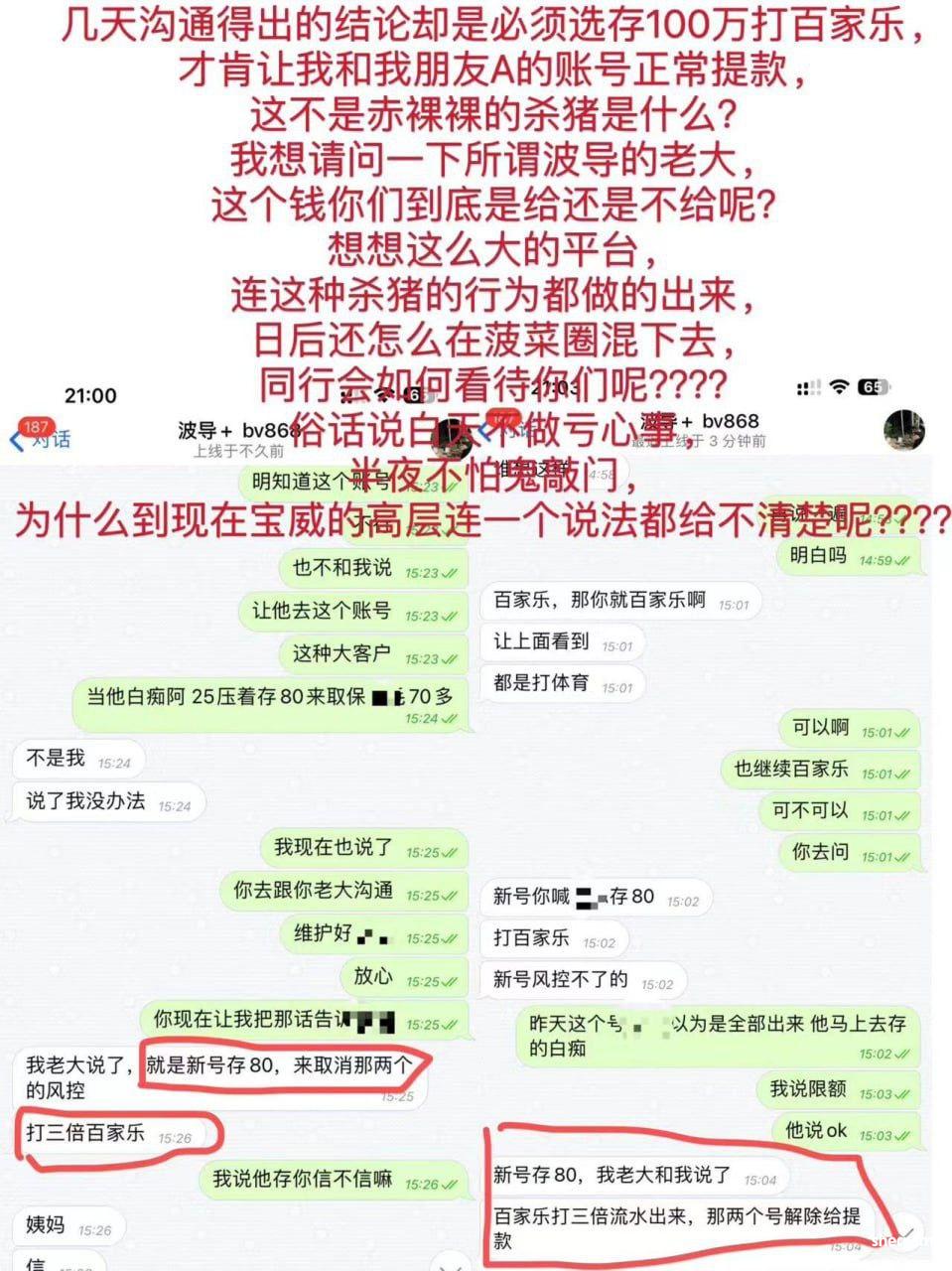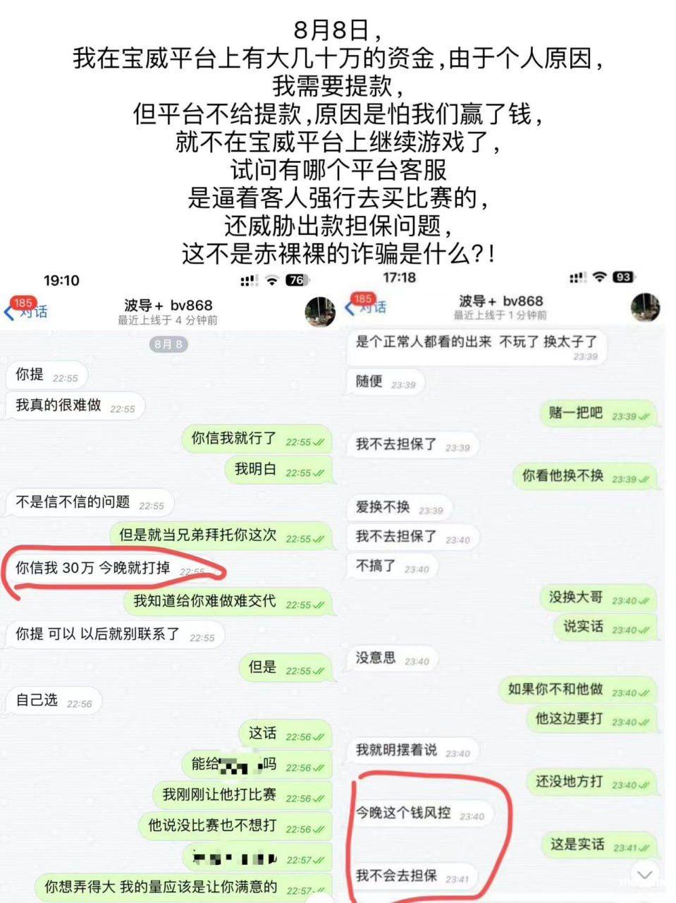 故事的起因在今年3月份,本人经过朋友推荐认识一个宝威平台名叫波导的代理,欧洲杯期间由于一开始上下分都非常正常,并且波导给我大量的平台优惠政策,想我投注量流水更大,当时本人觉得对自己来说无伤大雅,所以就按照他的要求对宝威平台进行充值。 建立在信任宝威平台的前提下,我加大了投注量,但从7月份开始,平台开始找各种理由借口拖延提款的时间,但好在名为波导的高管,都会在第一时间及时处理这些问题,并且得到了有效的解决,导致我越来越信任他,且进行了大金额充值,从而慢慢的掉入宝威精心谋划的陷阱....