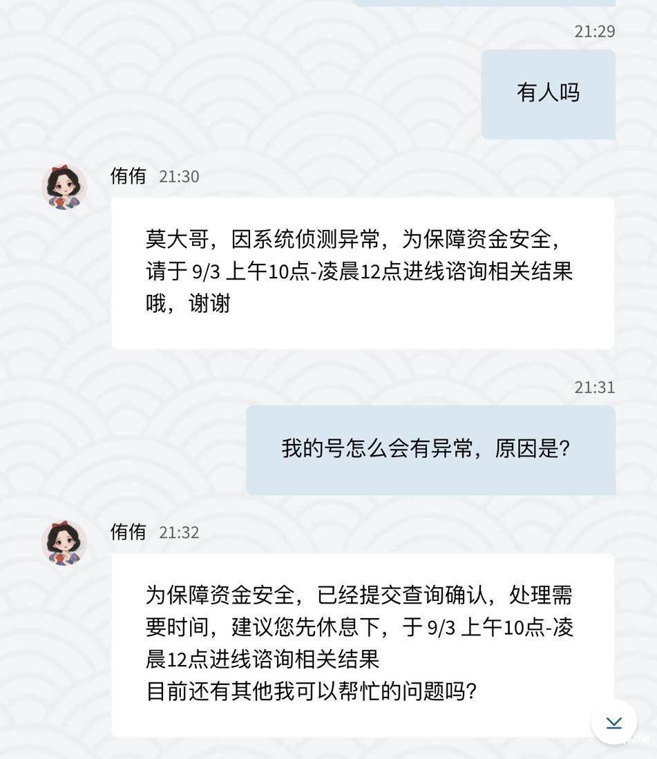 我抱着试试的心态 充值了1000元  1000元我觉得很少  就玩玩电子游戏算了   谁知道赢了23000块  在提款的时候  直接冻结了我的账户 不给我出款  我问客服 他说是我注单有问题  让我4天后咨询客服   我就等到9月3号又咨询了客服  9月3号又咨询客服 说等10号   这个平台妈的一点格局都没有  1000元人名币都黑  妈的 还不够我嫖娼呢  大家避雷。