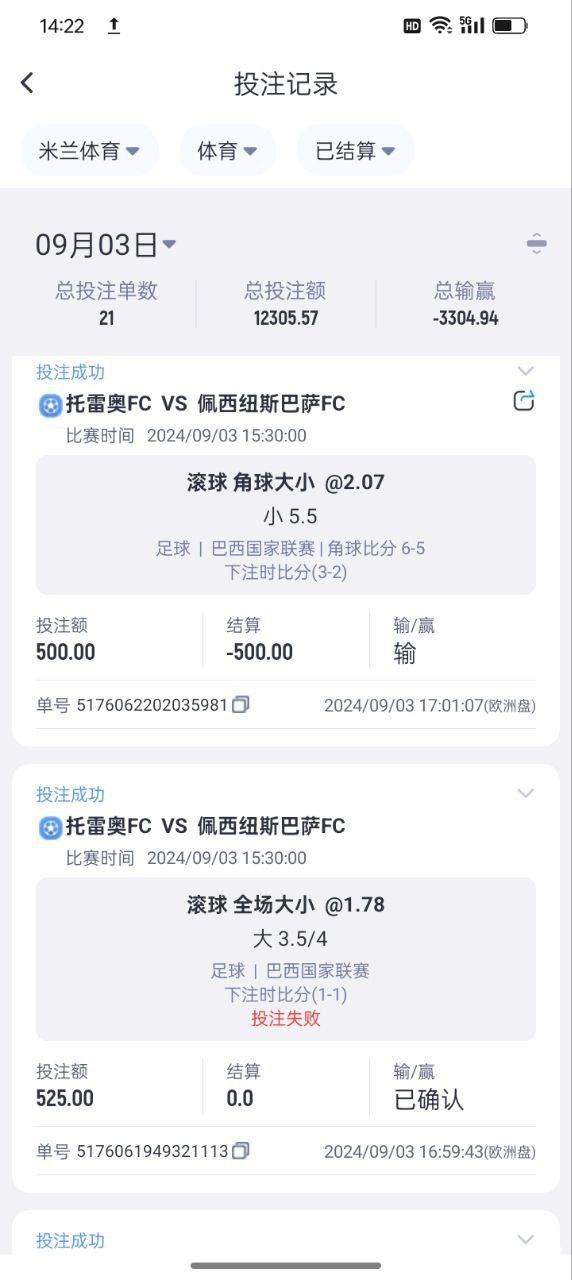 米兰体育诈骗 杀猪会员 昨天巴西比赛,89分钟下注小2.5,结果96分钟还是1-1。后面时间91分钟3-1就变成勒3-1。专员回复说比赛中断关了盘了,实际没有关盘,下注大2.5  大3大3.5/4全部取消,下注小的全部确认。一场比赛拼接视频来诈骗,杀会员,把会员杀了还叫不要曝光,还要会员给他们掩护。全程就是在拖处理事情过程中间还叫会员继续充值玩,准备黑一波。